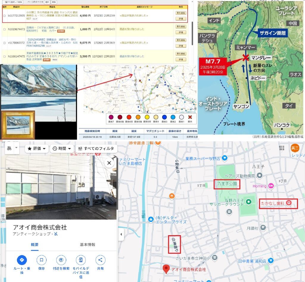 3月28日15:20頃 ミャンマーM7.7 3月23日21時23分 終了、小川博工 冬の木崎湖 F6 油彩 キャンバス 額装 画柳会 ル・サロン展銀賞 文部大臣賞 アオイ商会株式会社(さいたま市桜区神田445−9) https://auctions.yahoo.co.jp/jp/auction/b1177213935 ■3月25日に届いたヤフオクの絵画から3日後の3月28日にミャンマー大震災が起きたので、木崎湖まで調査に行きたかったが、4月18日の長野県北部M5.0震度5弱の震源がピンポイントの木崎湖でした。 発送元のアオイ商会の近くには「白神通り」や「たかなし歯科」や八王子公園もあり、再び「白神じゅりこ」の最新動画も気になる情報です。
