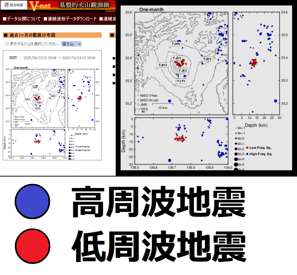 下の図は、防災科学技術研究所の「V-net 基盤的火山観測網」で公開されている「富士山」の震源分布図です。 2025年9月23日から2025年10月24日までのデータを見ると、富士山の山頂の「北側」や「北東側」の地下(深さ10km〜15km)で「低周波地震」がたくさん起きていることがわかります。
