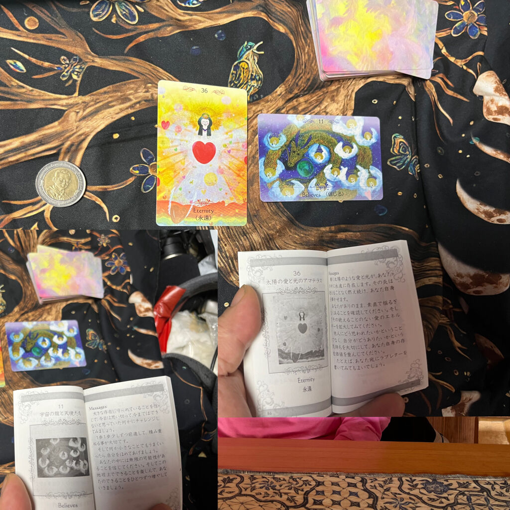 (1)おはよう新しい地球おはよう新しいわたしたち、妖精🧝♀️からは 深く隠されているもの 魔法の門 祝祭 の三枚です。心の奥底にある秘密や記憶隠されていたものを明らかにする時わたしたちは自由になれます。見知らぬ領域に足を踏み入れる事には勇気と信頼が必要です。踊り、遊ぶために外に出る時です。![]() |