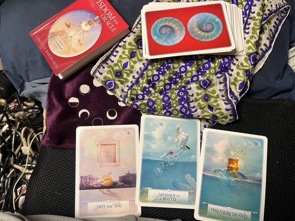 | (2)叡智のカードは あなたには不要なもの 瓶に入ったメッセージ 宝の島 の三枚です。自分には手に入らないものがあることを知ってください。スピリットはあなたの求めに応じてサインを送ってくれます。あなたは努力し、豊かさの信念に基づいて行動しました。そして突然、埋蔵された宝の地図を発見したのです。 ![]() |