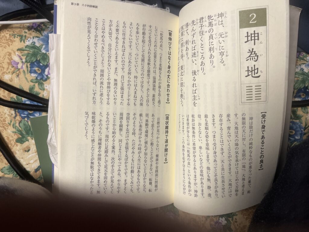(3)易は2坤為地の上爻(コンイチのジョウコウ)一 歩下がって進む時、受身であることの良さ、背伸びではなく身の丈に合わせる、現状維持で道が開ける八卦(ハッケ)の終わりです。こだわりは孤立を生みます。![]() |