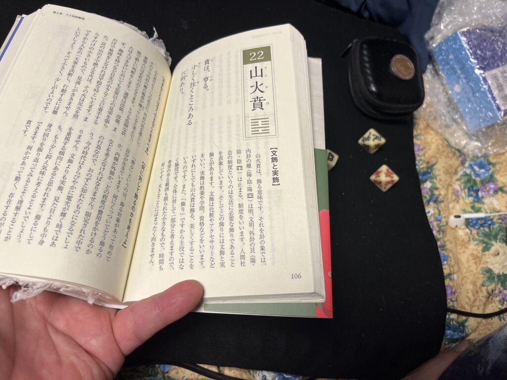 (3)易は22山下賁の四爻(サンカヒのヨンコウ)です。飾ることです。なんに対して飾るかを考え小さなことをしましょう。あれやこれや迷わず目先のことより実質的なものを優先して自分を大事にする事になります。今はこのことを心においてスピーディーに対処していきましょう。早い者勝ちと覚えていてください。(4)で終了です。![]() |