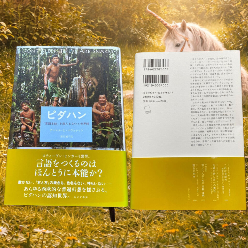 | (1)DON'T SLEEP THERE ARE SNAKES ピダハン 「言語本能」を超える文化と世界観 ダニエル・L・エヴェレット スティーヴン・ピンカーも驚愕。 言語をつくるのは ほんとうに本能か? 数がない、「右と左」の概念も、色名もない、神もいない……………… あらゆる西欧的な普遍幻想を揺さぶる、 ピダハンの認知世界。 (2)ピンカーは「パーティーに投げ込まれた 弾」と評した。デハンはアマゾンの地 に暮らす少数民族、400人を割るという彼 らの文化が、チョムスキーの パラダイムである「本能」論をるかが す論争を巻き起こしたという。 本書はビダハンの言語とユニークな認知 世界を描きだす科学ノンフィクション それを30年がかりで調べた若者自身の 感慨も交え、ユーモアたっぷりに語られる。 驚きあり笑いありで読み進むうち、私たち 自身に食う西政的な普遍幻想が根底から 崩れはじめる。 (3)とにかく驚きは言語だけではないのだ。 ビダハンの文化には右/左の概念や、数の 概念、他の名前さえも存在しない、神も創世神話もない。この文化が何百年にもわ たって文明の影響に抵抗できた理由、そし てビデハンの生活と言語の特徴すべての源 でもある。彼らの堅固な哲学とは…………………? 著者はもともと福音派の献身的な伝道師 としてピチハンの村に赴いた。それがビダ ハンの世界観に衝撃を受け、逆に無神論へ と導かれてしまう。ピダハンを知ってから 言語学者としても主流のアプローチとは袂 を分かち、本書でも普遍文法への批判を正 面から展開している。 インスタURL https://instagram.com/p/DWSy5oTkjDI/?utm_source=qr ![]() |