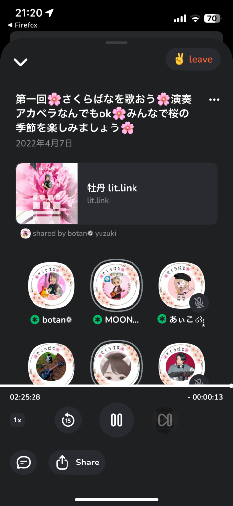 | さくらばな第一回みんなで歌う 4年前のリプレイ聴いていました https://www.clubhouse.com/room/xBlowZZR?utm_medium=ch_room_xr&utm_campaign=7RcsnkNteyaGUbyRhRYsZQ-2207774&chs=QKlUpYvR9%3A4ibHii3kqNyEIBHap2dAsStYUSCPeSsbHd9lhPx_TMc ![]() |