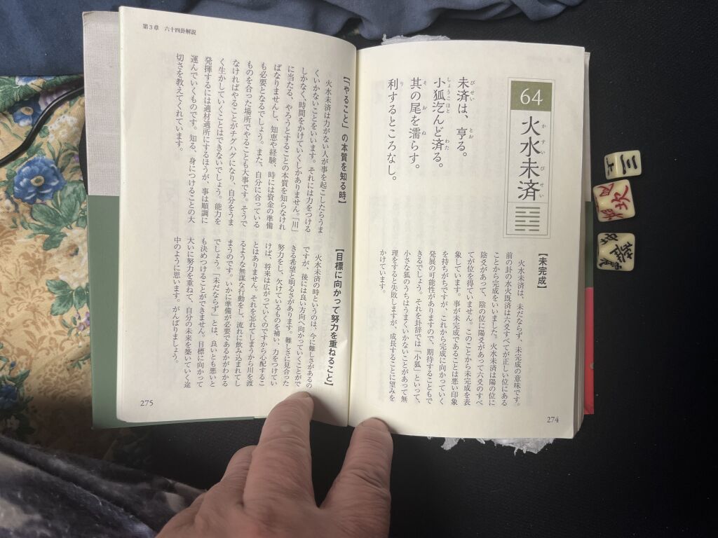 (4)易は62雷山小過の三爻(ライザンショウカのサンコウ)です。無理をせずに常に謙虚に控えめに。すべての様子を見て事情がはっきりしたり相手の状況が変わるまで待つ事が災いから逃れる方法です。ついうっかりのないように。(4)で終了です。![]() |
