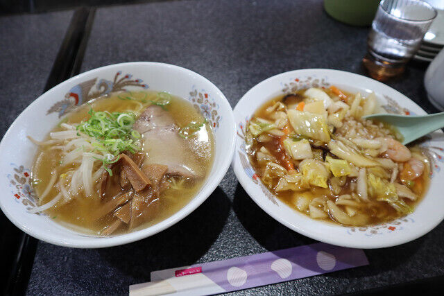 私は「野菜いっぱい」彼の君は普通の皿うどん+餃子。