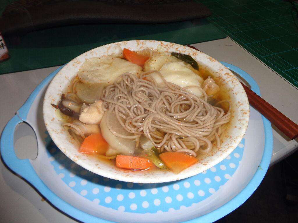夕飯には出来たてのお雑煮用お汁に乾麺の蕎麦と丸餅3個の
