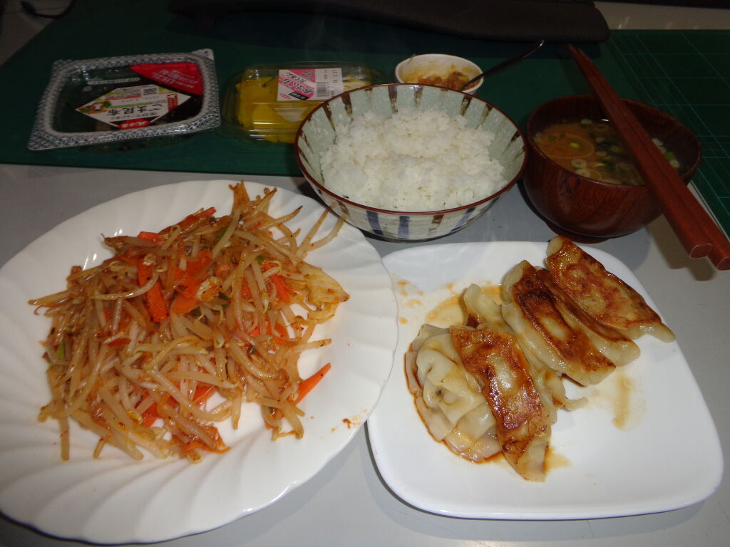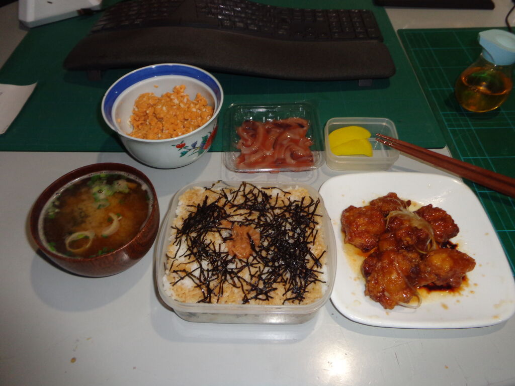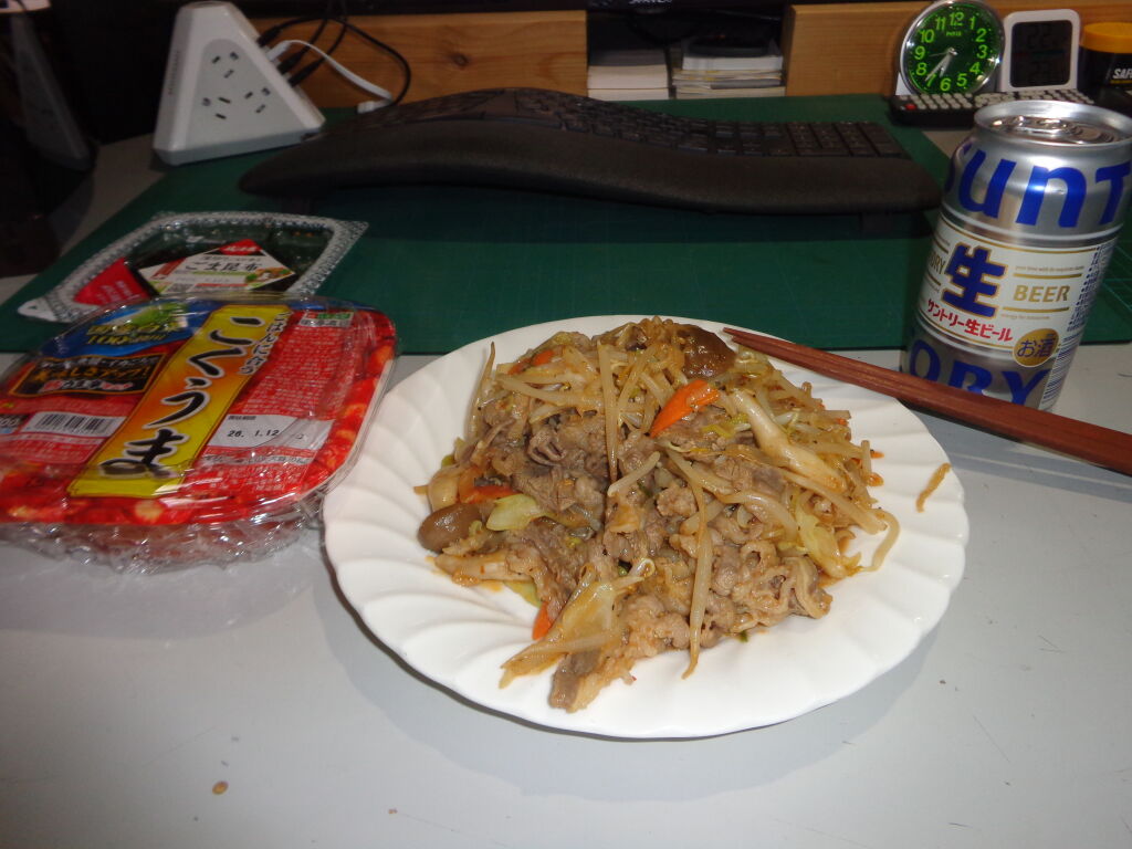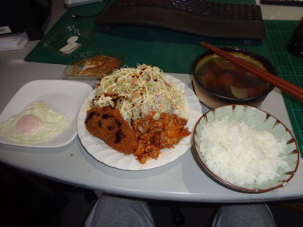お昼は昨日買った豚肉・一口カツ・カット野菜で