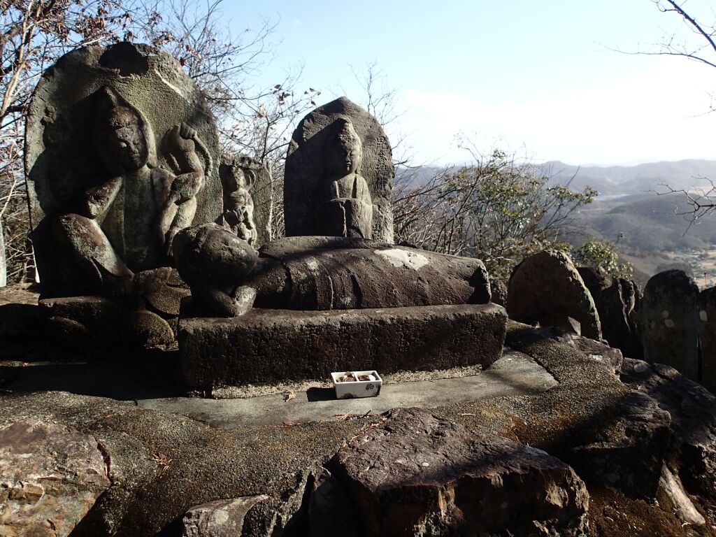 浄因寺を抜け更に登っていくと関東ふれあいの道が通る尾根の手前に四十九院涅槃台があり、そこにお釈迦様が可愛い寝姿で横たわっています。実物を見る前はタイの黄金の寝釈迦の巨大なイメージがあったので、その小ささに声を上げたものですが、今はその慎ましさと石仏の少し苔むすお姿は里山に似つかわしく、私は大好きな仏様の一つです。今日も日向ぼっこを楽しんでいらっしゃいました。