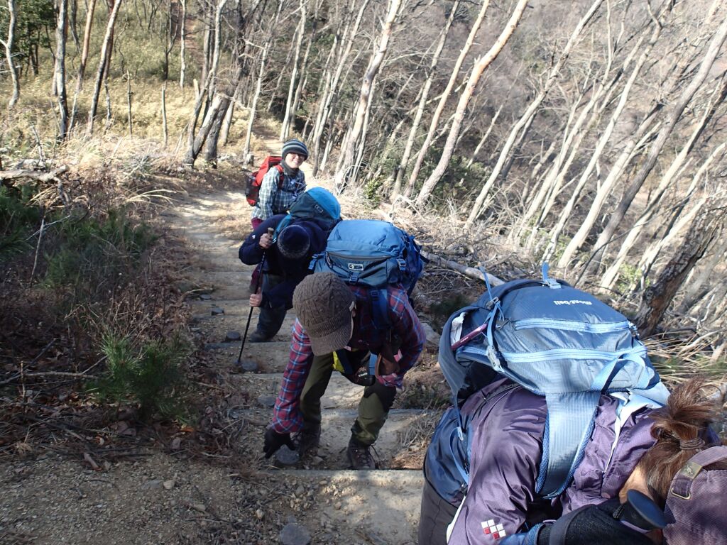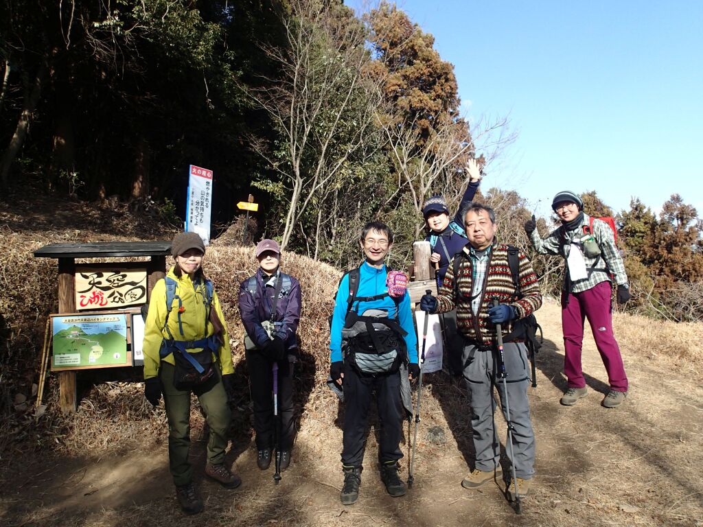 稜線上では常に強風にさらされ山頂で写真を撮る気持ちも失せていましたが、大岩山の毘沙門天に通じる林道に出た時にやっと全員が入った写真を撮らねばと気付きこの写真を撮りました。なんとなく皆の顔に安どの表情が表れていますね。