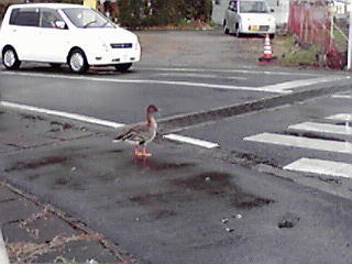 可愛いカモちゃんですね、交差点で信号待ちですね(笑)。