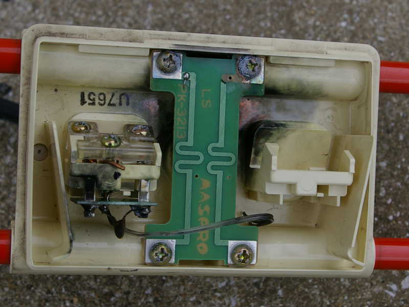 写真はアンテナの同軸ケーブル接続部のボックスですが、配線やプリントパターンが焦げて飛んでいました。このケースのカバーは開けたのではなくて、何処かに吹き飛んでいて探せませんでした。
