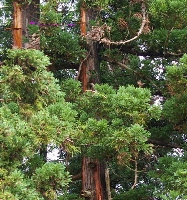 雷のスパークが走り、表皮がはがれてしまった、杉の木です。