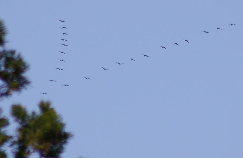 私も、庭でたまたま桃の木の枯れ枝を刈っていたら、どこからともなく聞き覚えのある鳴き声がしたので空を見上げると鶴の編隊が・・・