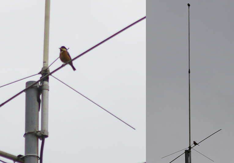 アンテナのトップに止まっているのもこの鳥でどちらがオスでしょうね?