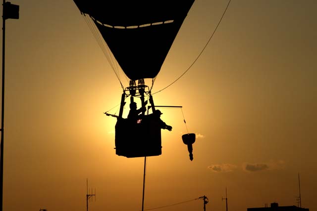 高い所から急降下したり観客すれすれ低空飛行で柱につるされた鍵を目指して、バルーンをコントロールしながら操縦しますが見てると興奮します、60機ほど参加して成功したのは2機だけでした、写真は夕日を背にキーを取る瞬間ですが、このバルーンは手が届かず残念!。