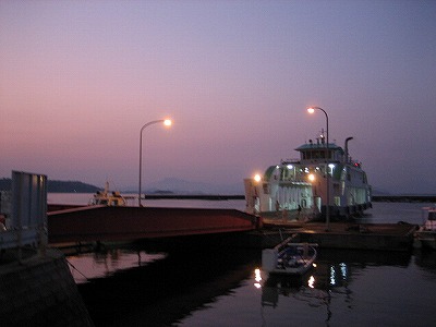 そこで朝6時のフェリー乗り場です。人もまばら、未だ真っ暗でした。