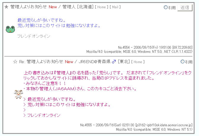 (jh6aam)が入っていない「管理人よりお知らせ」だから、偽物だとすぐわかったので、レスを入れませんでした。本当に最近の荒らしは巧妙ですよね。一体どんな得があるというのでしょうか、困ったもんですね。