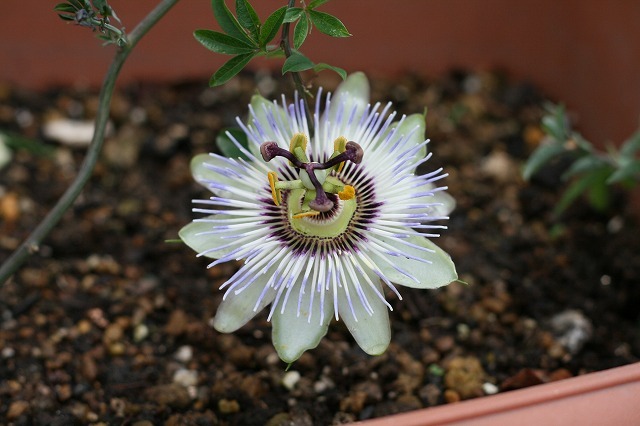 そんな中、ふと時計草の鉢を見たら咲いていましたよ。