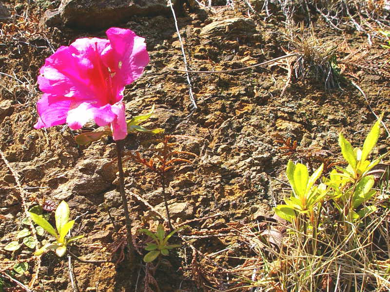 裏庭の土手上にツツジを植えているのですが、種が落ちてツツジやヒノキの苗が芽だってくるのですが、このツツジ葉っぱより大きな花を早くもつけていました。