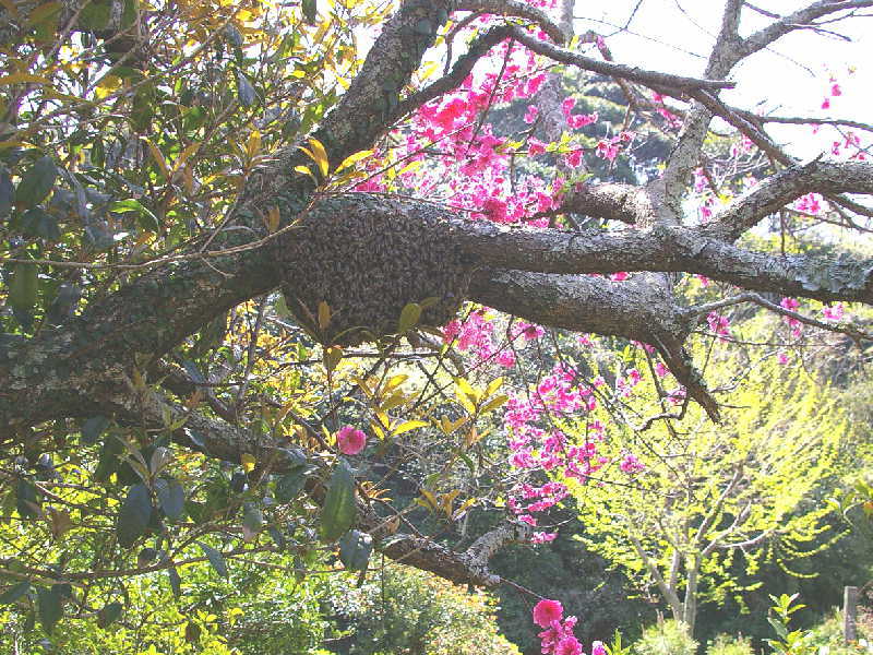 写真は、数日前に桃の木に分蜂した蜜蜂を貰ってきました。