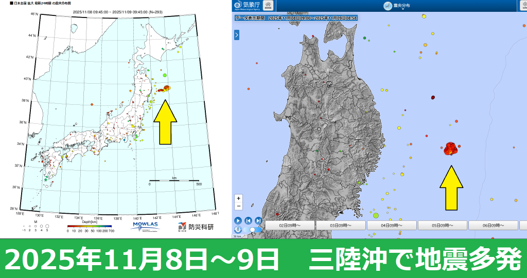 ■気になる地震リスト(三陸沖) ------------------------------------------------------------------- 2025年11月09日09時17分 三陸沖 深さ10km M4.9 震度2 2025年11月09日07時33分 三陸沖 深さ10km M4.9 震度2 2025年11月09日07時27分 三陸沖 深さ10km M4.8 震度1 2025年11月09日07時15分 三陸沖 深さ10km M5.8 震度3 2025年11月09日06時04分 三陸沖 深さ10km M5.4 震度3 2025年11月09日05時29分 三陸沖 深さ10km M5.5 震度2 2025年11月08日11時36分 三陸沖 深さ10km M4.6 震度2 2025年11月08日10時13分 三陸沖 深さ10km M4.7 震度1 -------------------------------------------------------------------- ※出典:気象庁「地震情報」