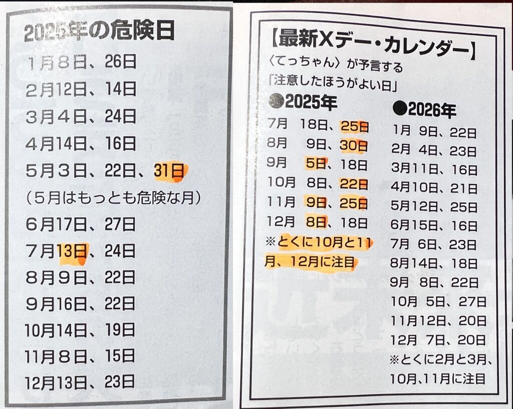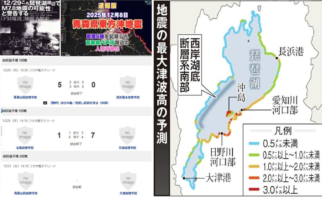 ■2024/11/9、学研ムー 2024年 12月号(三茶のポルターガイスト) ■2025/7/9、学研ムー 2024年 12月号(三茶のポルターガイスト) てっちゃん通信が昨年11月発売号の記事で予告した2025年の危険日をチェックしたら、震度4以上の地震が起きたケースは、合計25日中2日しか的中していなかったが、今年7月発売号の危険日では、12日中7日的中していたことがわかった。 三択問題に等しい次の総理を林芳正と予告して外したので、私もまともに記事は読まなかったが、年末に三連続的中した事で1年後の未来は全く当てにならないが、半年くらいならマグレ当たりする事は分かった。 一時は的中率100%の嘘の評価もあったが実際は10%くらいが相場で、3割打者になれば世界最高の予言者でしょう。 特に注目する予言としては、7月発売号に「琵琶湖周辺で群発地震が起きてから北海道で震度6→巨大地震」という流れですが、場所の限定は的外れでも琵琶湖を限定した事だけが気になる。 たまたま3回戦に勝ち進んだ大津高校(熊本)を琵琶湖の大津高校と勘違いしたので、1月2日の大津高と富山第一の試合に注目したい。 https://soccer.yahoo.co.jp/youth/category/hst/schedule/31442/31/?gk=11