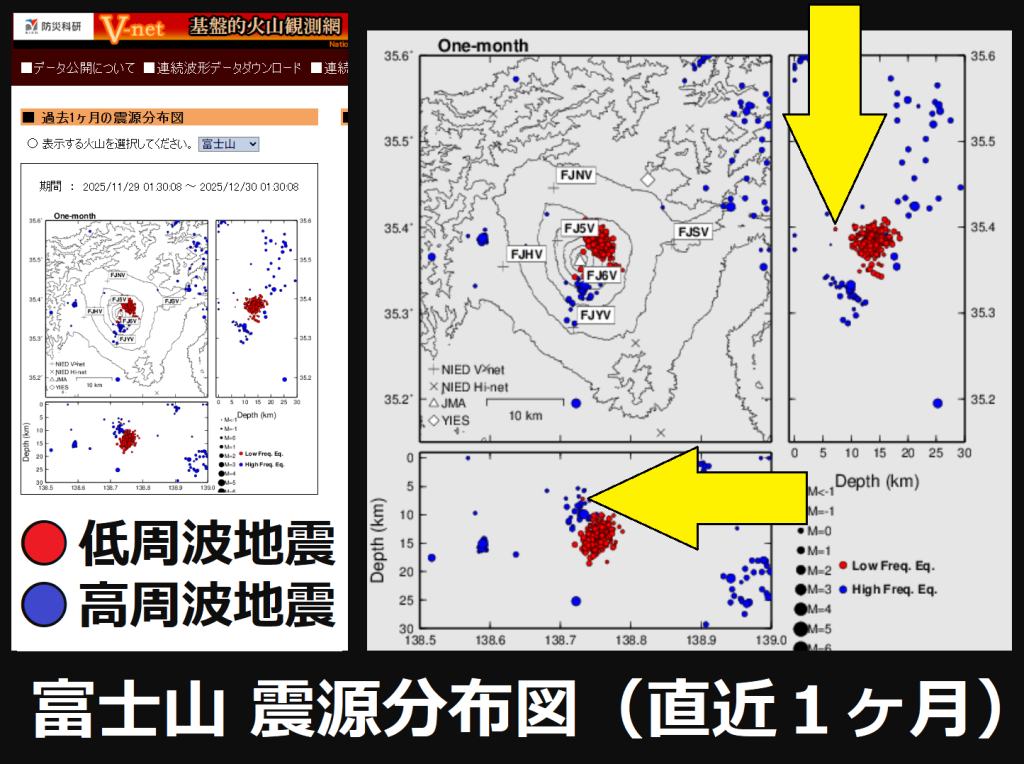 いちばん下の図は、防災科学技術研究所の「V-net 基盤的火山観測網」で公開されている「富士山」の「震源分布図(低周波・高周波)」です。 この図を見ると、いま「富士山」で「震源の浅い低周波地震」がよく起きていることがわかります。
