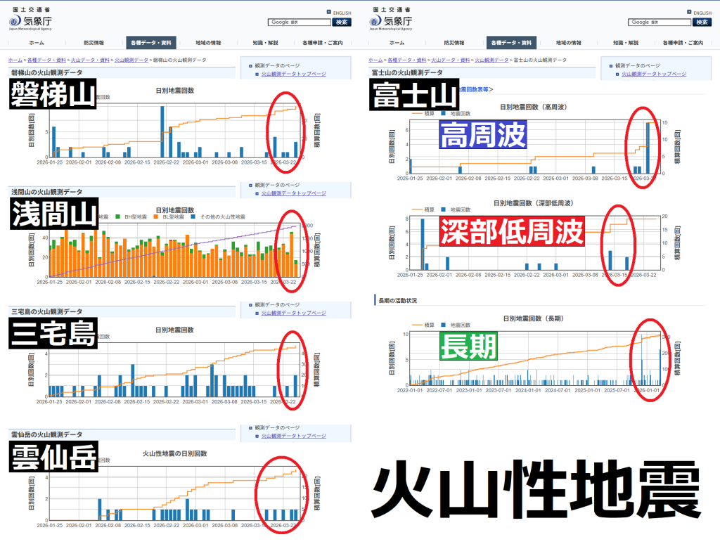 下の左の図は、気象庁のホームページで公開されている「富士山」の日別地震回数(高周波・深部低周波・長期)のグラフです。