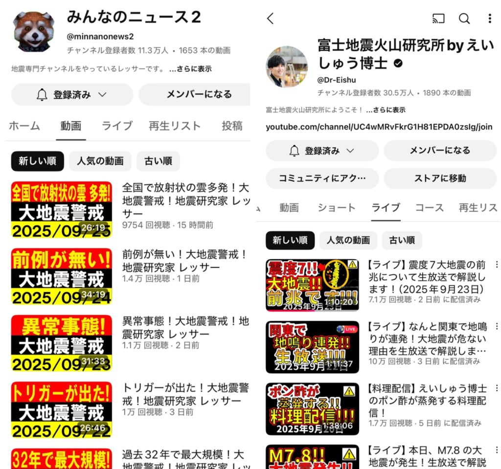 「みんなのニュース2」「地震研究家 レッサー」と称するYouTubeチャンネルでは、頻繁に「大地震警戒」「○○がヤバい」「放射状の雲多発」などの警告動画を投稿しています(多数の短い動画・ライブ配信が確認できます)。