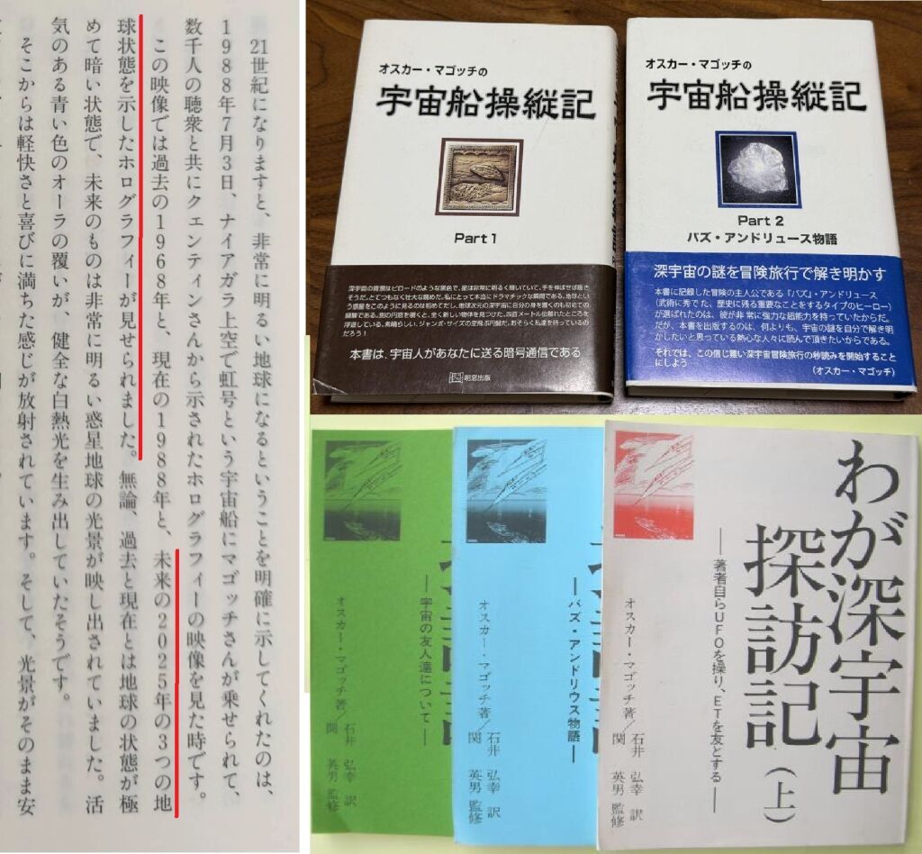 予言「関英男博士の予言2025年」『生命と宇宙』(関英男/飛鳥新社/1998) 94ページ 1928年ハンガリー生まれ、カナダに移住されたオスカー・マゴッチさんは、宇宙船を操縦した経験と、宇宙人とのコンタクトの濃密な経験を『宇宙船操縦記』Part1, 2(オスカー・マゴッチ著/石井弘幸 訳/関英男 監修/明窓出版/2008)に記したおかたです。 関英男さんは、マゴッチさんと親しく、彼は2025年について「非常に明るい地球になる」と聞いたそうです。 https://note.com/20250705/n/n7c092118260e ■この情報は1975年から1988年にすでに海外でも公開されていましたが、2025年限定の世界で唯一の予言が50年も前から予告されてきた証拠となる日本語版の2冊の蔵書は手元にあります。 1979年からこの手の本は全て読み漁って来ましたが、2025年の手掛かりになる唯一の本でしょう。 地球の悪人が一人残らず絶滅して、事件事故すら起こらなくなる2025年の明るい未来という解釈だと思います。
