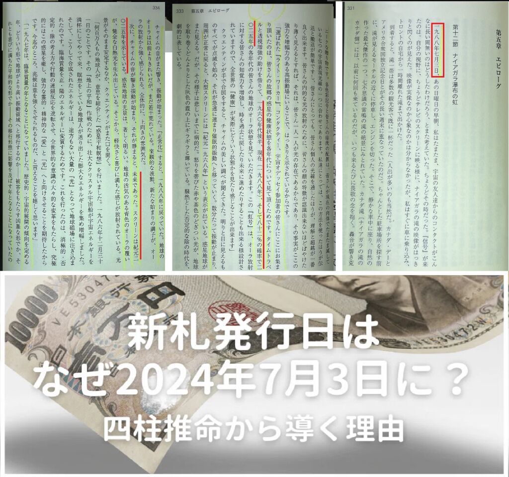 新札発行日はなぜ2024年7月3日に?四柱推命から導く理由 https://note.com/kurumimo22/n/n1c8b9d080650 ■この7月3日説を読んでも、まるでチンプンカンプンの1ミリの説得力もないが、私の蔵書の「宇宙船操縦記」のエピローグ(P331〜339)からの結論として、1988年7月3日の未来のトップシークレットから、2025年になる前に日本政府は1984年以来の新札発行を、今年7月3日を計画して来たと言える画像をまとめてみました。