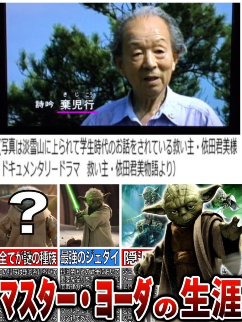 1980年6月28日公開映画「スター・ウォーズ エピソード帝国の逆襲」に初登場したヨーダを知った時、ジェダイの騎士の長老のモデルは、県道104号沿いにある大正池の畔に立つ宗教団体の依田(ヨーダ)氏だと思った。 1974年6月、神幽現救世真光文明教団を立教(教祖:依田君美の生涯) https://www.mirokukan.jp/lifetime.html ■ヨーダも山奥の沼の畔に住んでいて、何てったって教祖は56億7千万年後に来臨する弥勒であり、イスラエル国旗の六芒星を門柱とした建物に住んでいた。 そこから僅か300mのポイントに朝ドラ「花子とアン」の家を作ったので、日本政府も米国アカデミーもここの地形こそ世界の未来を預言している事に気が付いていたのでしょう。 宗教の教祖は猫も杓子も救世主になりたがるが、磔になって死ぬようなパフォーマンスでもしないと誰も相手にしませんが、人物よりここの地形が救世主と言ったところでしょう。