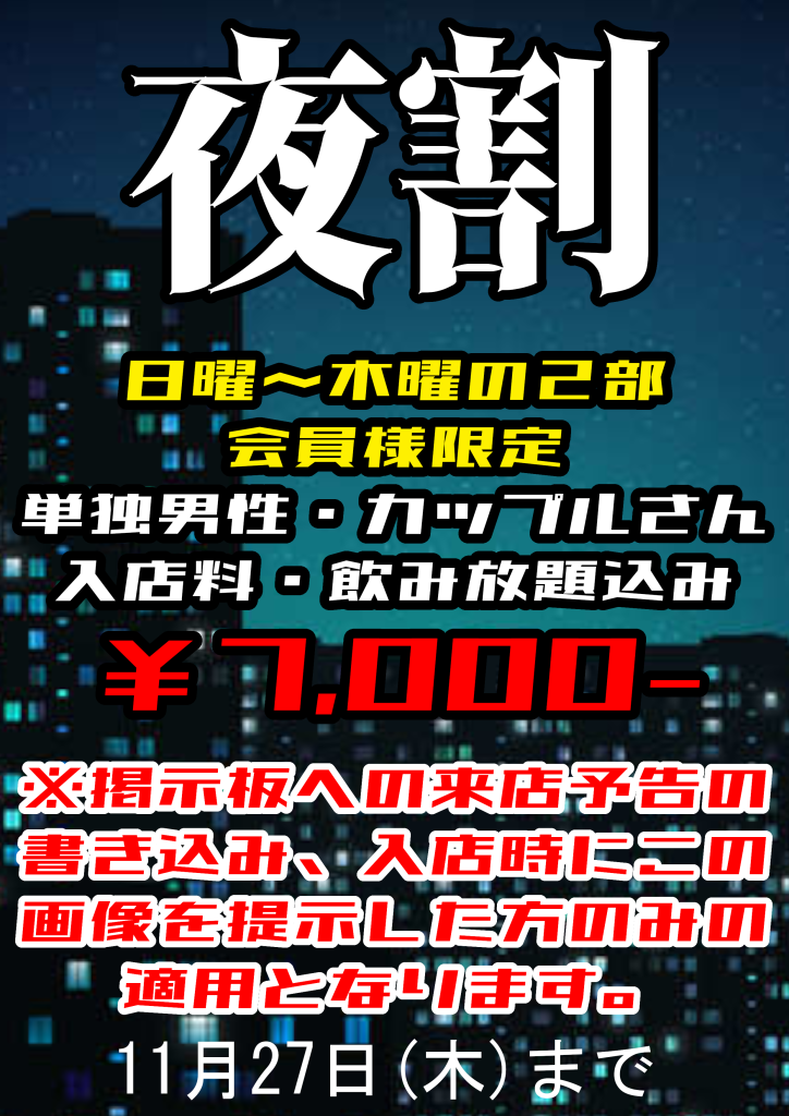 来店予告掲示板に書き込みで、男性は飲み放題チケット2000円が【1000円】に❣️(※全てのお客様に飲み放題チケットをご購入頂いております。)