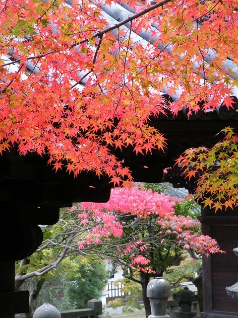 本瓦葺きの屋根が紅葉の赤を引き立てて 素敵な写真ですね。