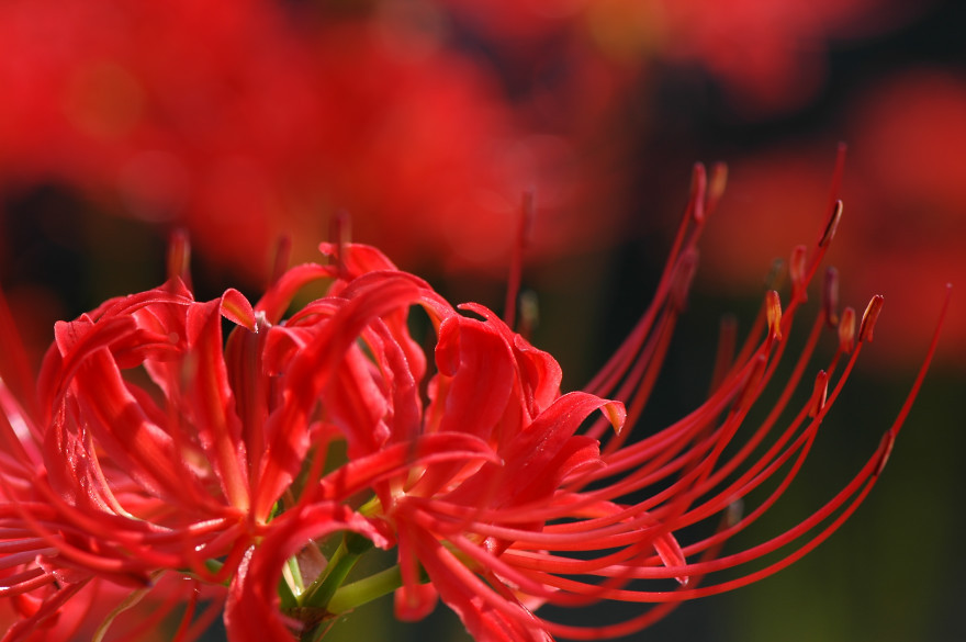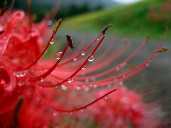 零れ落ちそうな雫の彼岸花のアップ こんなアングルが大好きです。