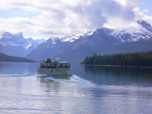 雪を抱く山々 静かな湖面に 進み行く船の航跡