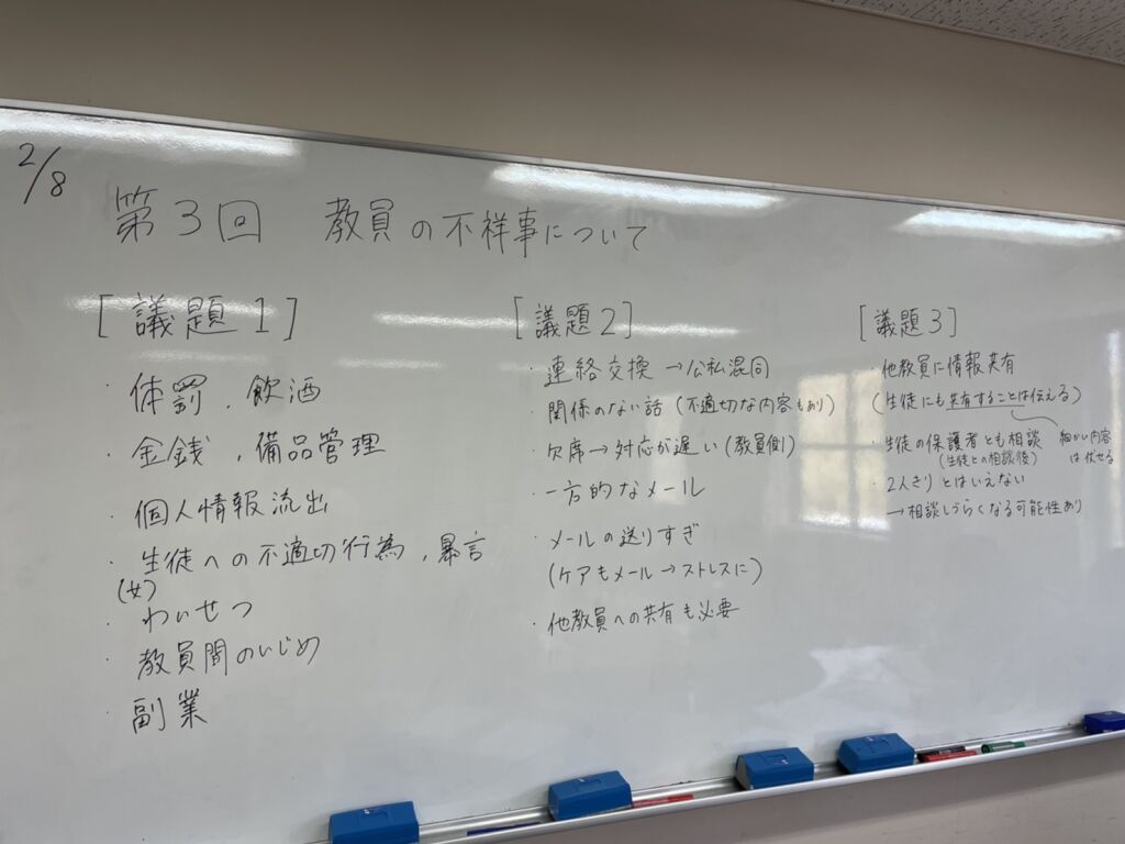 テーマ:「教員の不祥事」について 場所:A棟4階の共同研究室 時間:13時〜