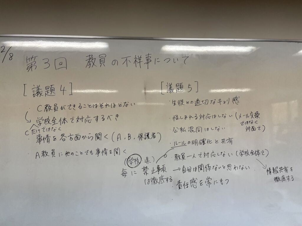 5つの議題を通して、「教員の不祥事を減らす」ため、そして「適切な教育相談を行う」ため、以下のような点が大切であるという意見が出ました。