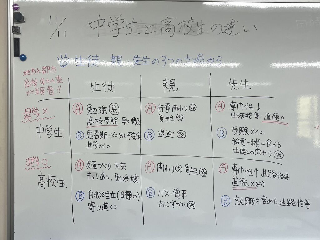 現在四年生は、それぞれの中学校・高校で教育実習を終えました。そこで、中学生と高校生の違いについて、皆さんで議論したいと考えています。