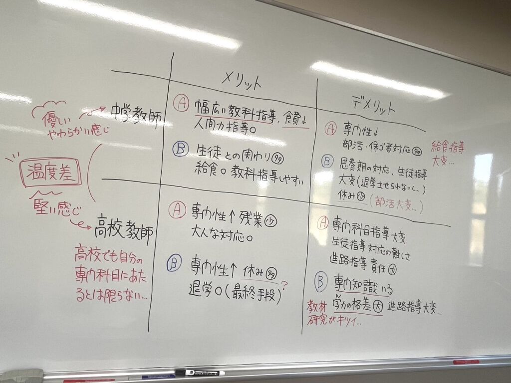 中学教師と高校教師のメリット・デメリットを考えました。これもグループで意見を交換した後、全体で共有しました。