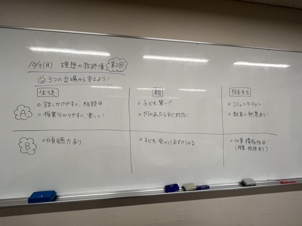 まずは、生徒・親・校長先生といった3つの立場になって求める教師像というのを考え、全体で共有しました。それぞれの視点に立って教師というものを考えることで、自分の理想の教師像の手がかりになるようにしました。