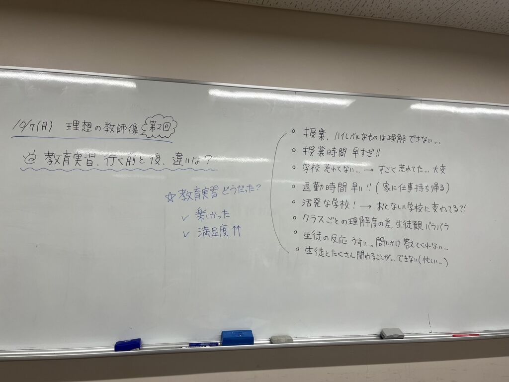 今回のディスカッションは、教育実習を経験した後、もう一度自らの理想の教師像について考えました。教育実習を経て自分の教育観の変化や変わらないことなどを整理することを目的に話し合いを行いました。