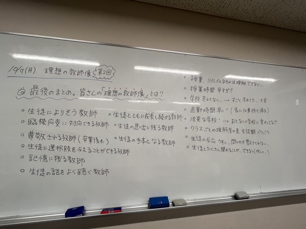 最後にまとめとして、自分の理想の教師像を考え、1人1つ発表しました。それぞれの教師像があり、言葉にすることで自分自身で整理できたかなと思います。