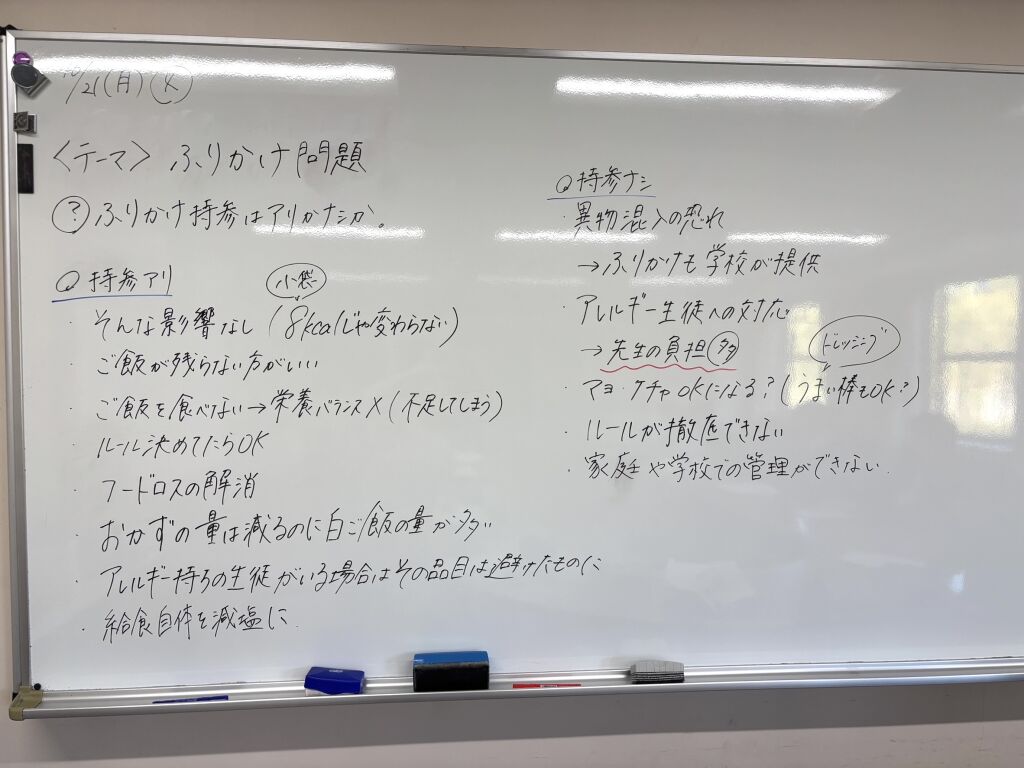 今回のディスカッションテーマは、「ふりかけ問題」ということで「食育」と関連しながら討論しました。一連の流れを以下に説明します。